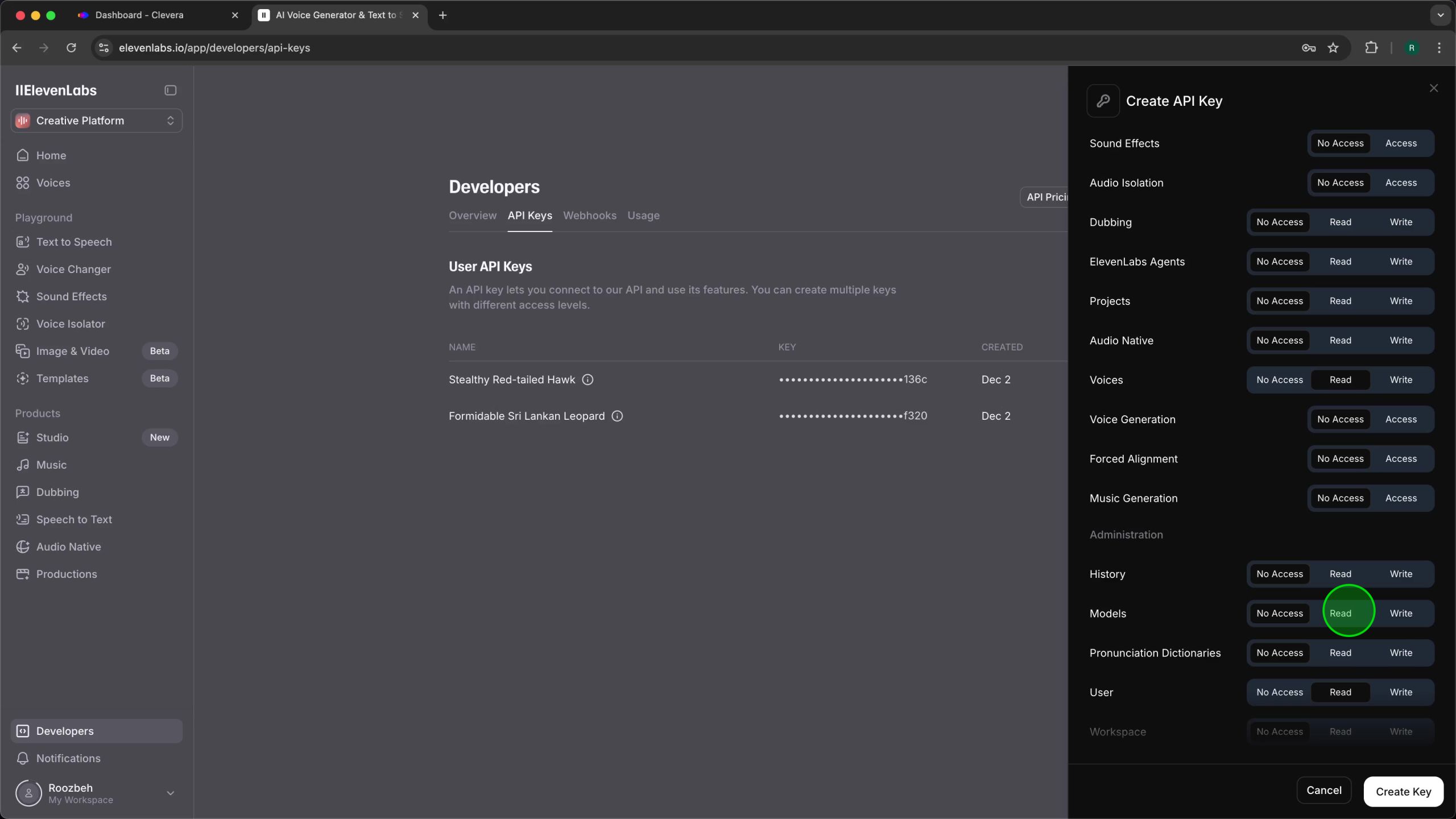 Scroll down the “Create API Key” sidebar to find the Voices, Models, and User categories.- For Voices, click Read. This allows Clevera to list and select available ElevenLabs voices.