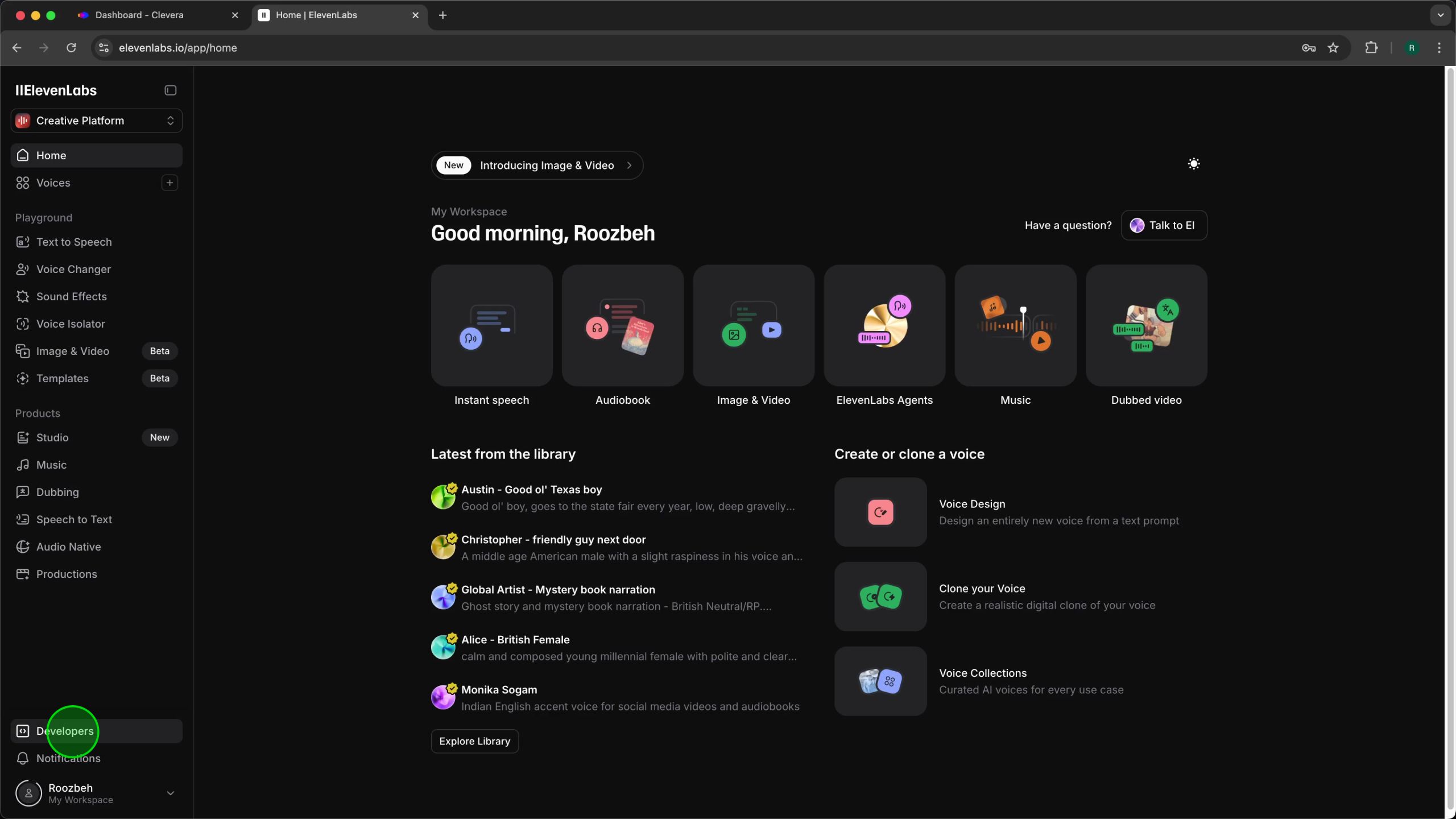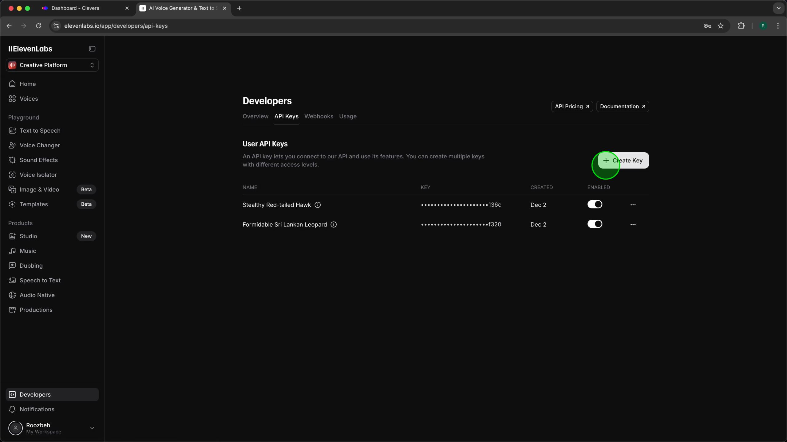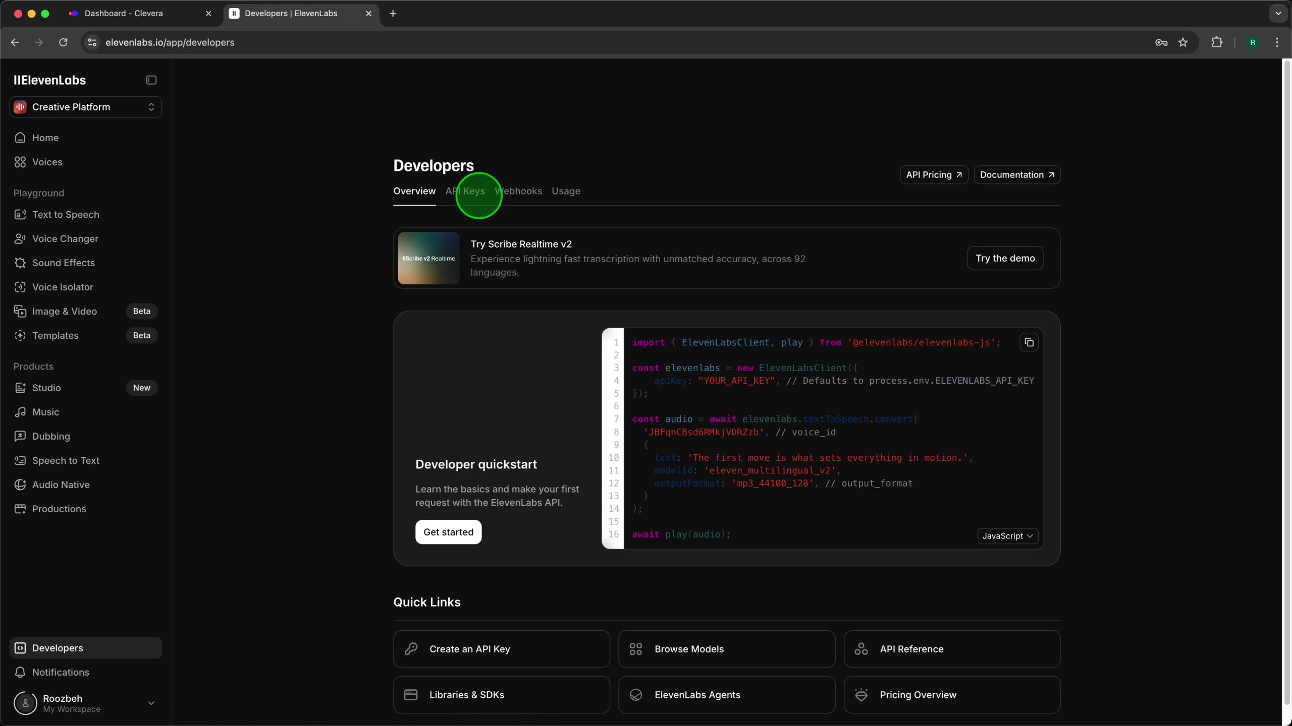 To connect Clevera with ElevenLabs, you first need to create a dedicated API key in your ElevenLabs account. This key acts as a secure credential, allowing Clevera to access ElevenLabs’ voice generation services on your behalf. It’s crucial to set the correct permissions to ensure smooth functionality while maintaining the security of your ElevenLabs account.Step 1: Navigate to the ElevenLabs Developers Panel