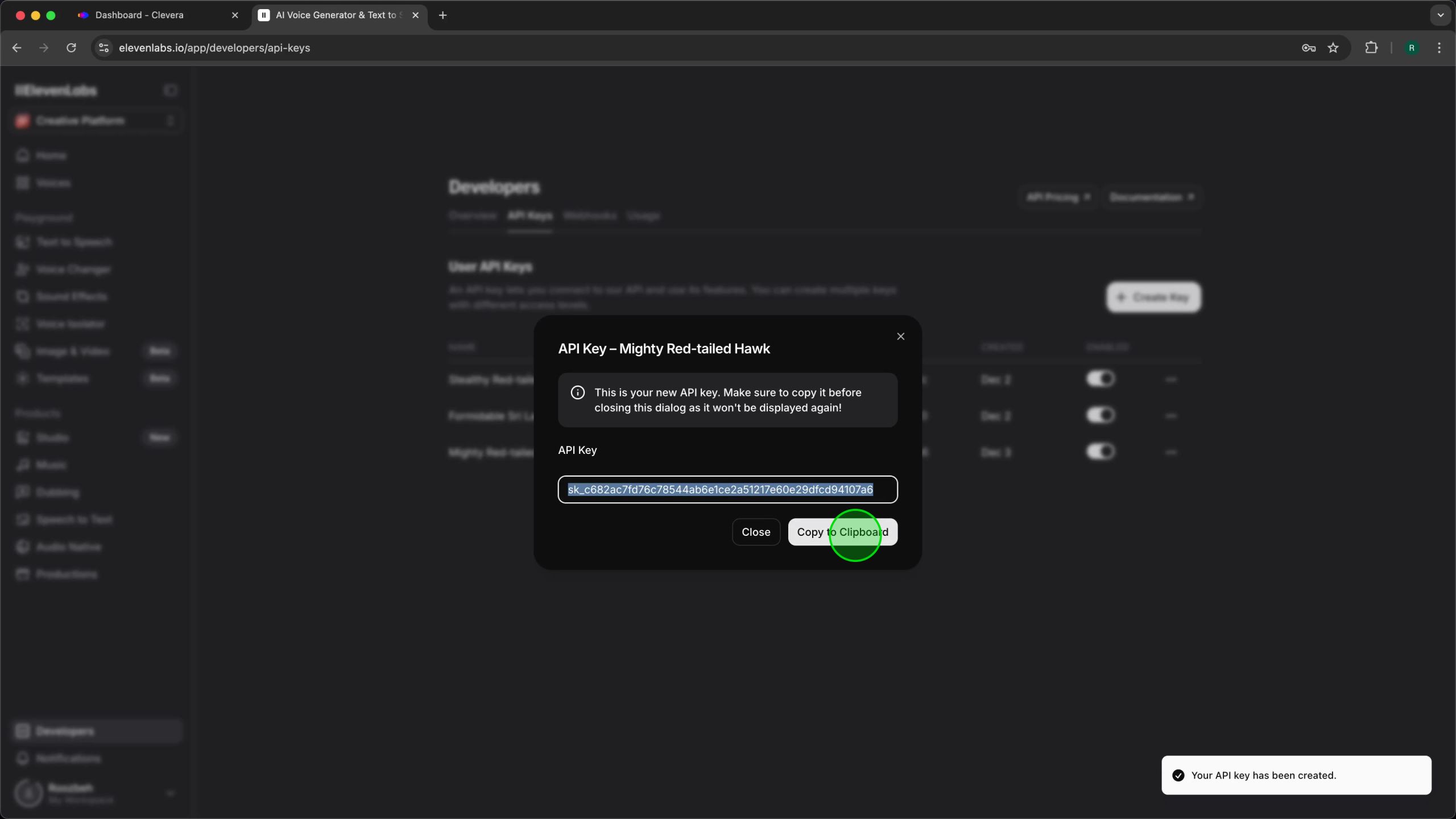 TL;DR: To integrate ElevenLabs into Clevera, first generate an API key in **ElevenLabs Developers > API Keys **with Text-to-Speech access and Read permissions for Voices, Models, and User data; then paste and save this key in Clevera’s Account Settings > ElevenLabs API Key section, and finally select ElevenLabs as the voice engine when regenerating a video’s voiceover.
