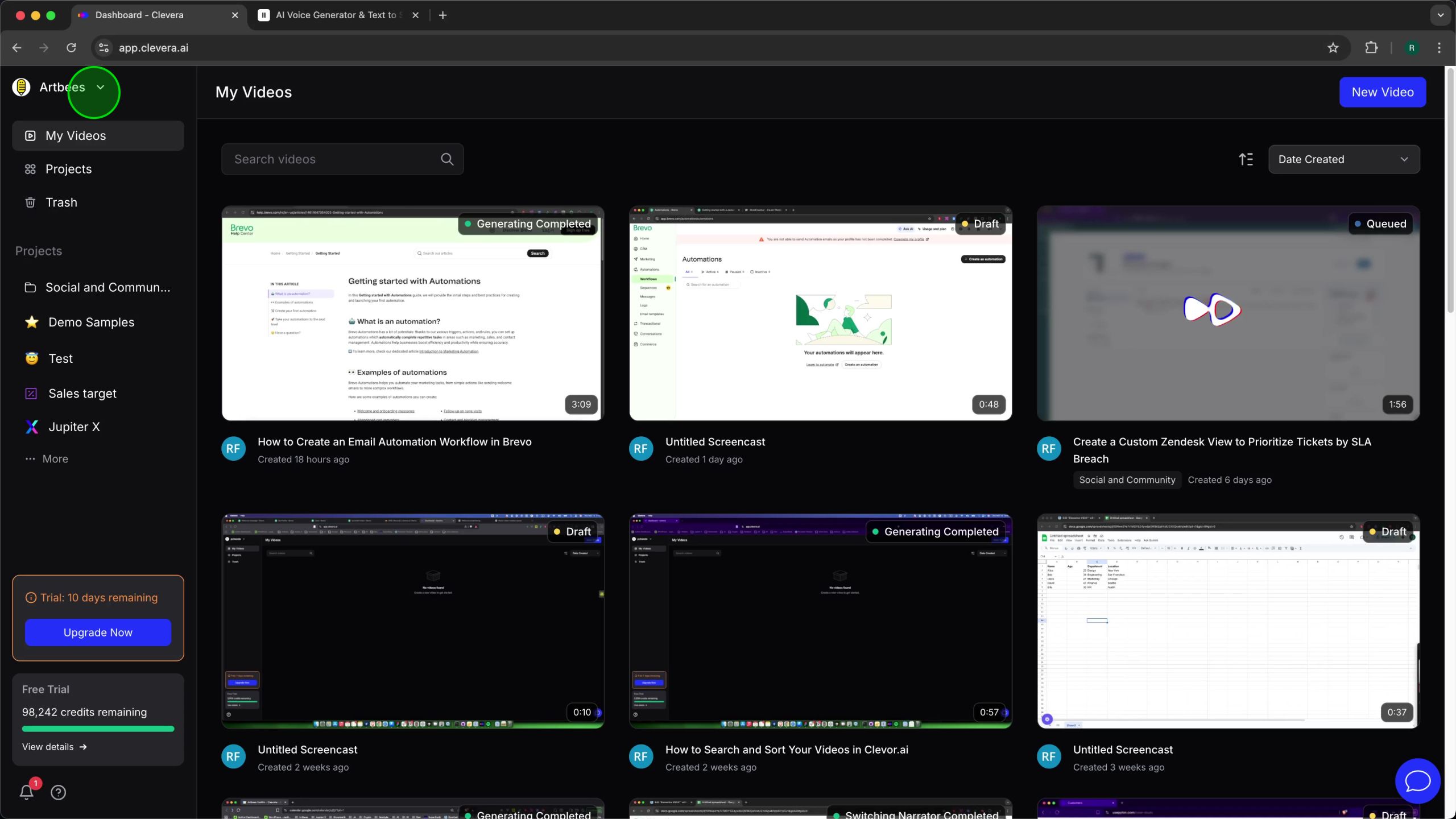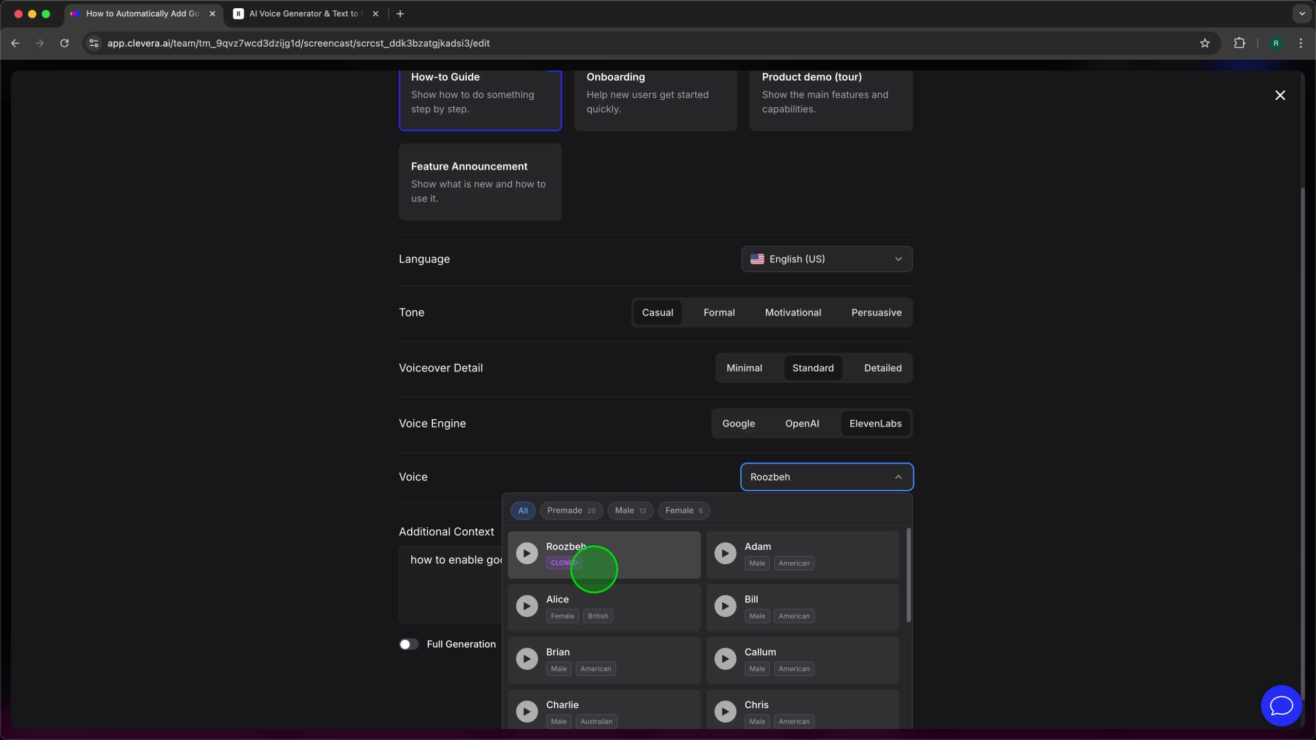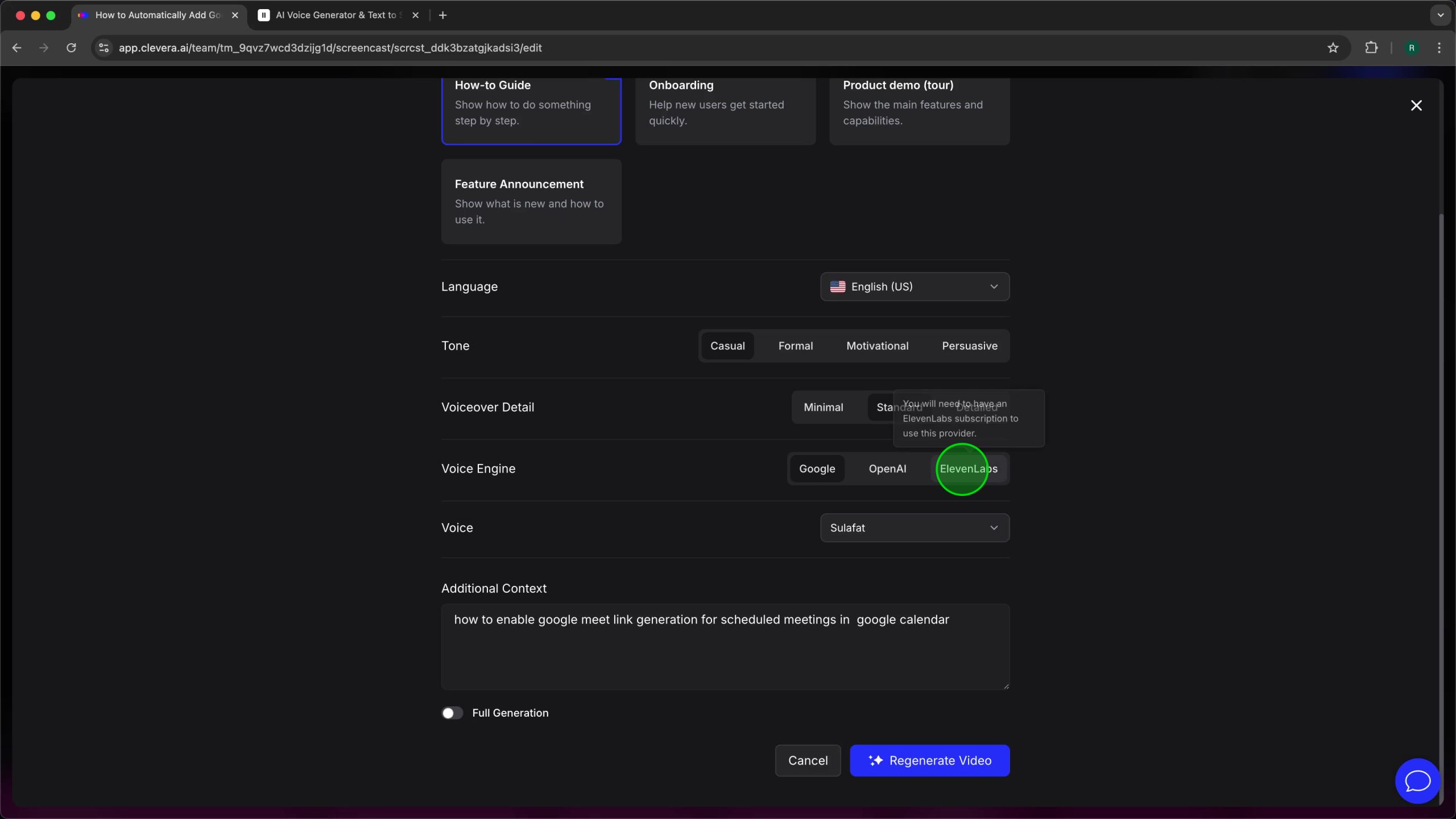 Now that ElevenLabs is integrated, you can use its voices in your video projects. On the left-hand navigation panel, click My Videos. The “My Videos” page displays a grid of all your video projects. Locate the video you wish to regenerate the voiceover for. In the video, a video titled “How to Automatically Add Google Meet Links To Your Google Calendar Booking Pages” is selected. Click on the desired video thumbnail to open it in the Clevera video editor.Step 4: Choose ElevenLabs as the Voice Engine and Select a Voice