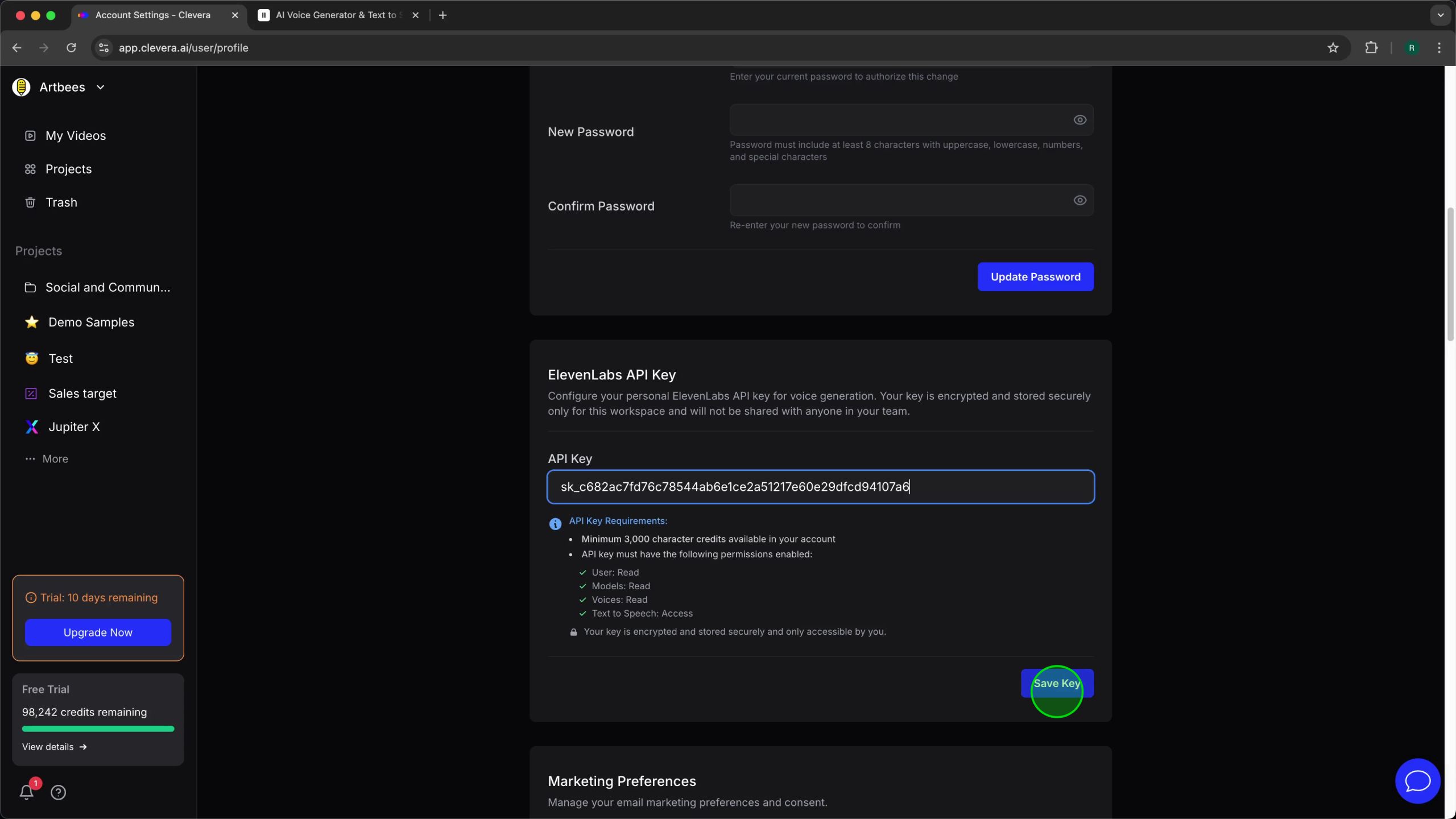 Clevera stores your ElevenLabs API key securely and encrypted, and it will not be shared with anyone in your team.