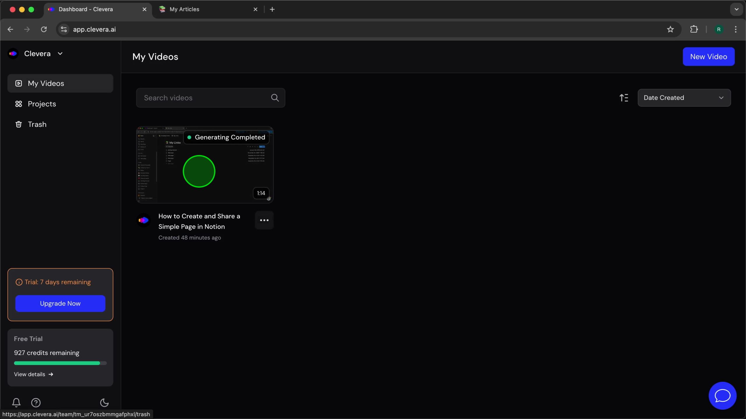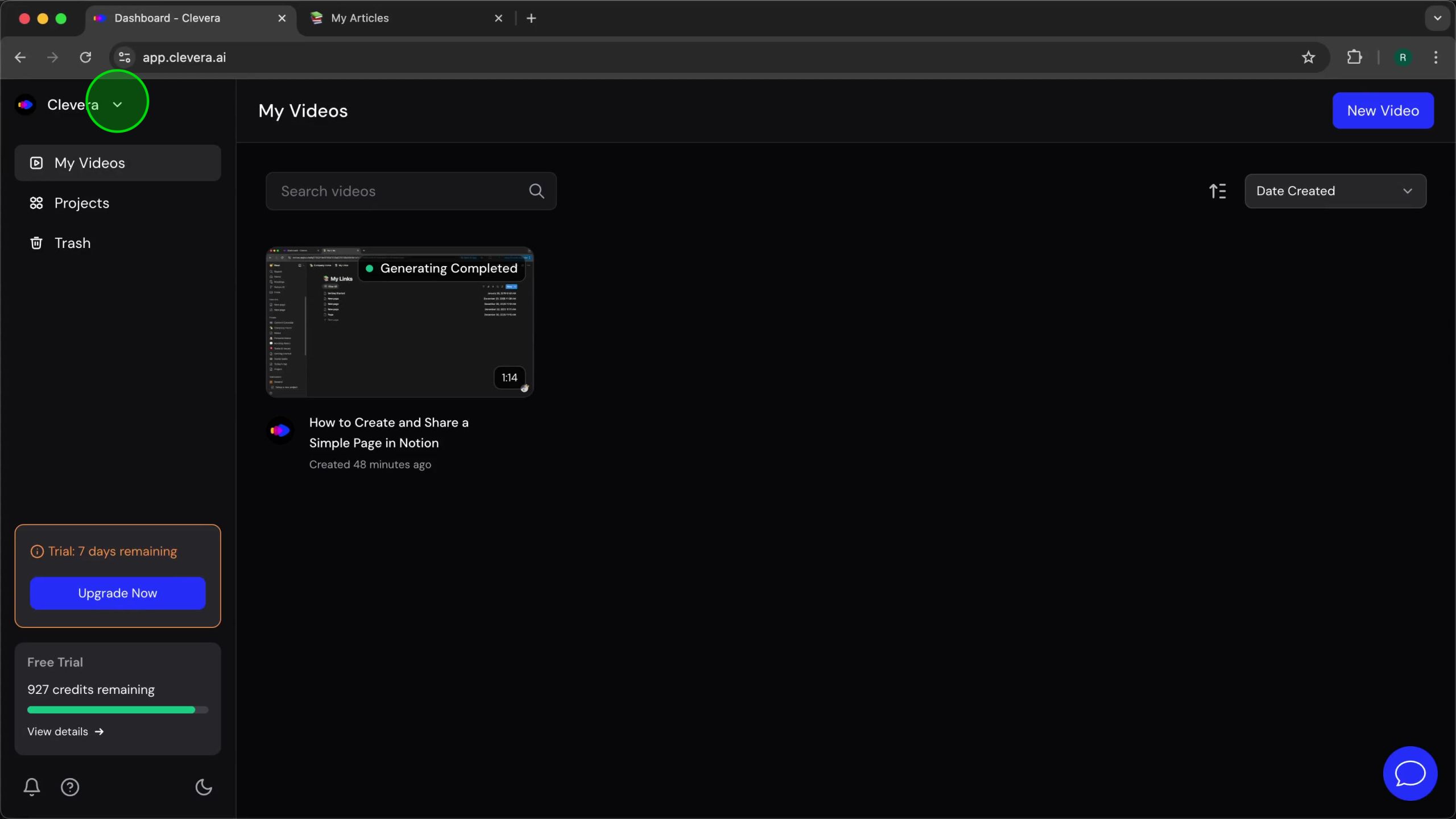 On the left sidebar of the Clevera interface, locate and click My Videos. This action will take you back to your main video library, where all your generated content is listed.