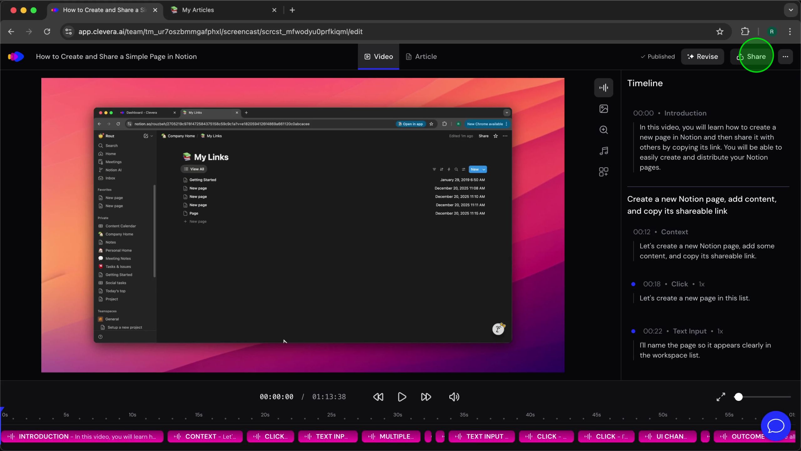 By following the steps in this tutorial, you will successfully authorize Clevera to access specified pages within your Notion workspace, and then publish an existing Clevera article directly into a designated Notion database. This integration simplifies content transfer, ensuring your articles and their associated video content are available in Notion with minimal effort.