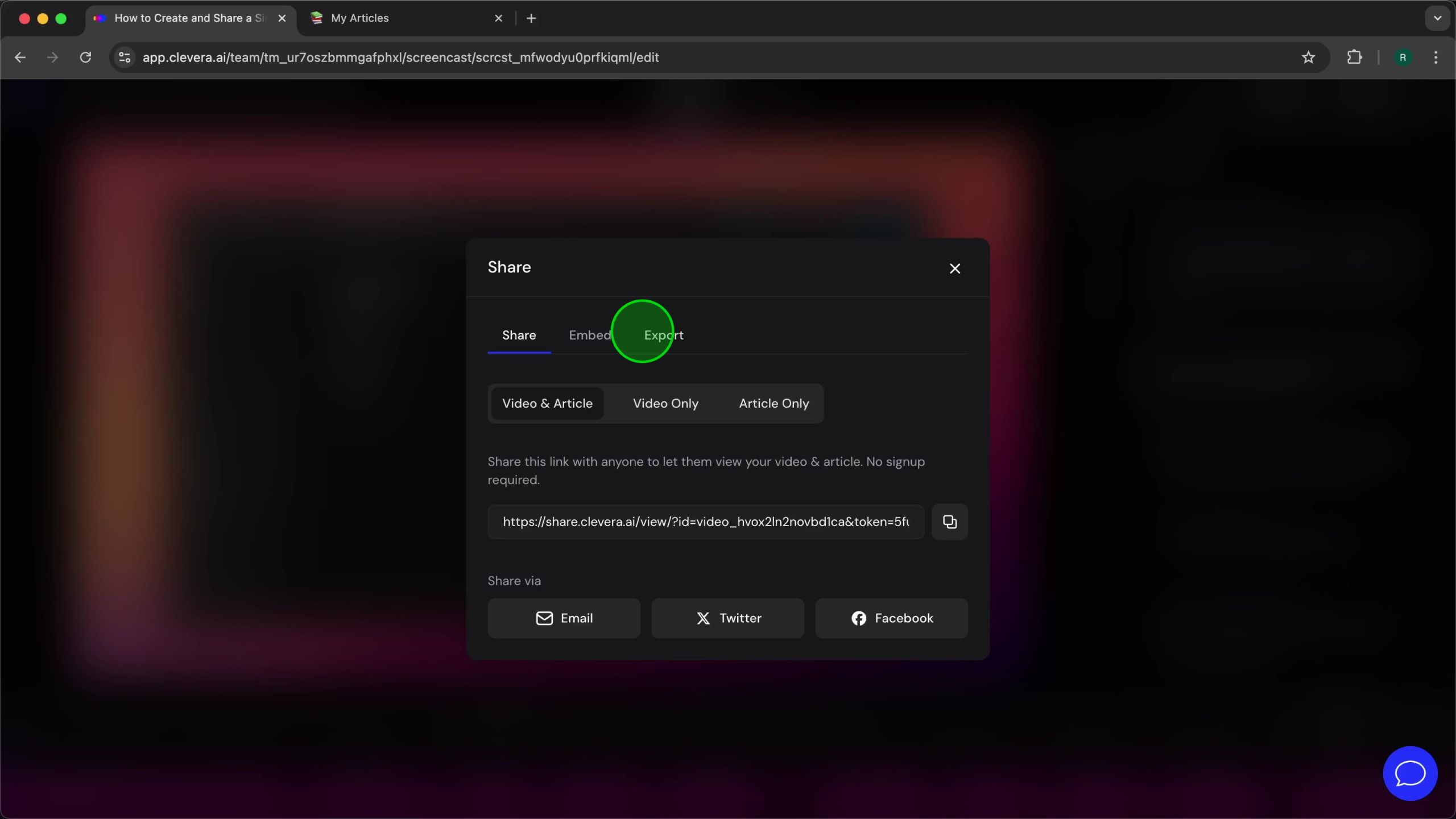 💡 Tip: The Share dialog is where you can control export formats and platform publishing; take a moment to explore the tabs so you know all available options.