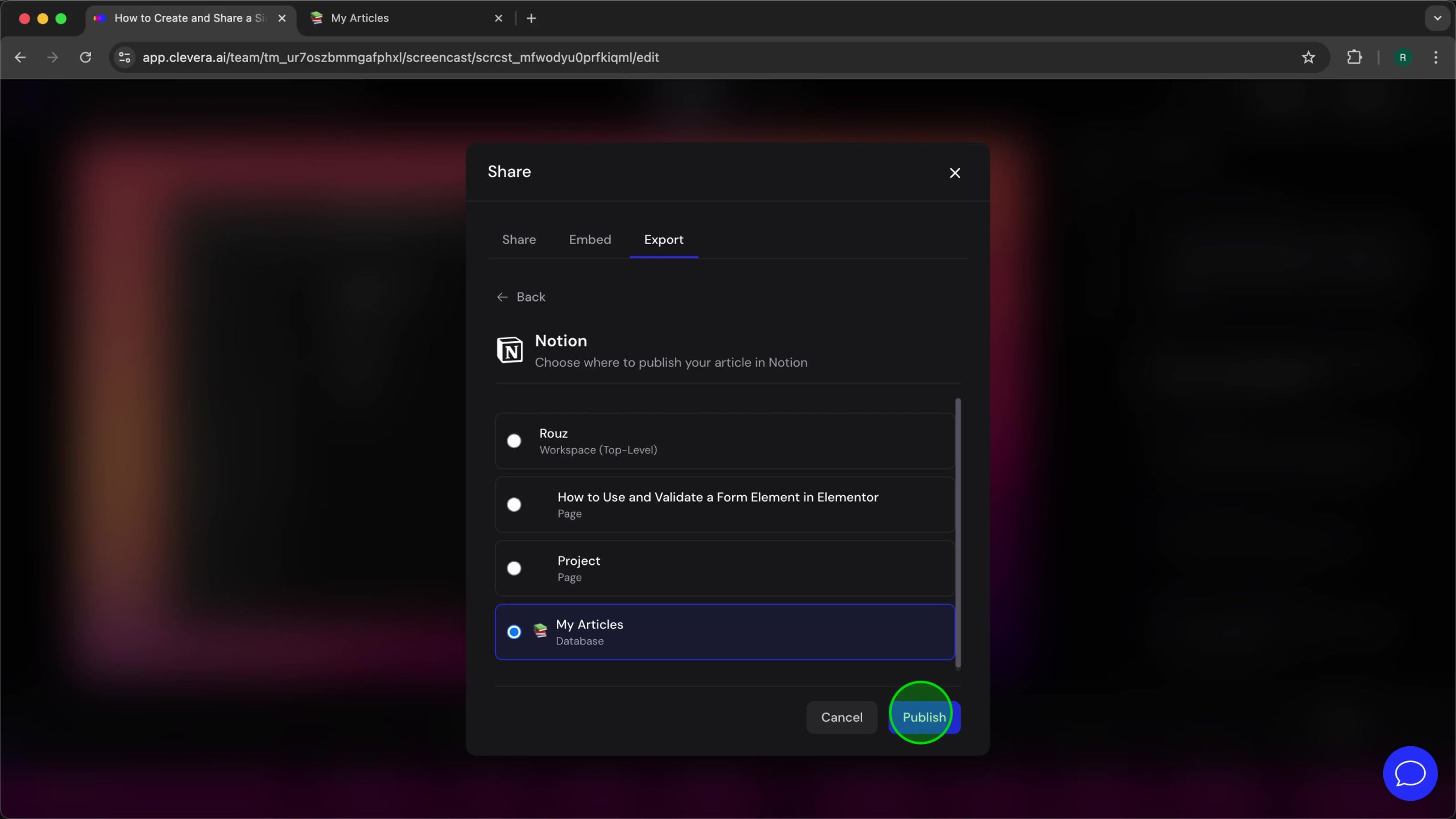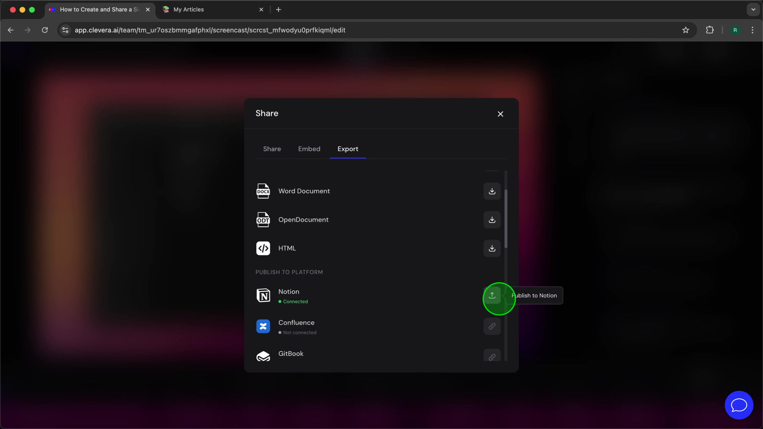 With Clevera successfully connected to your Notion workspace, you’re ready to publish articles directly. This process involves navigating to the specific article in Clevera, accessing the Share menu, and using the Export tab to select Notion as your publishing destination.