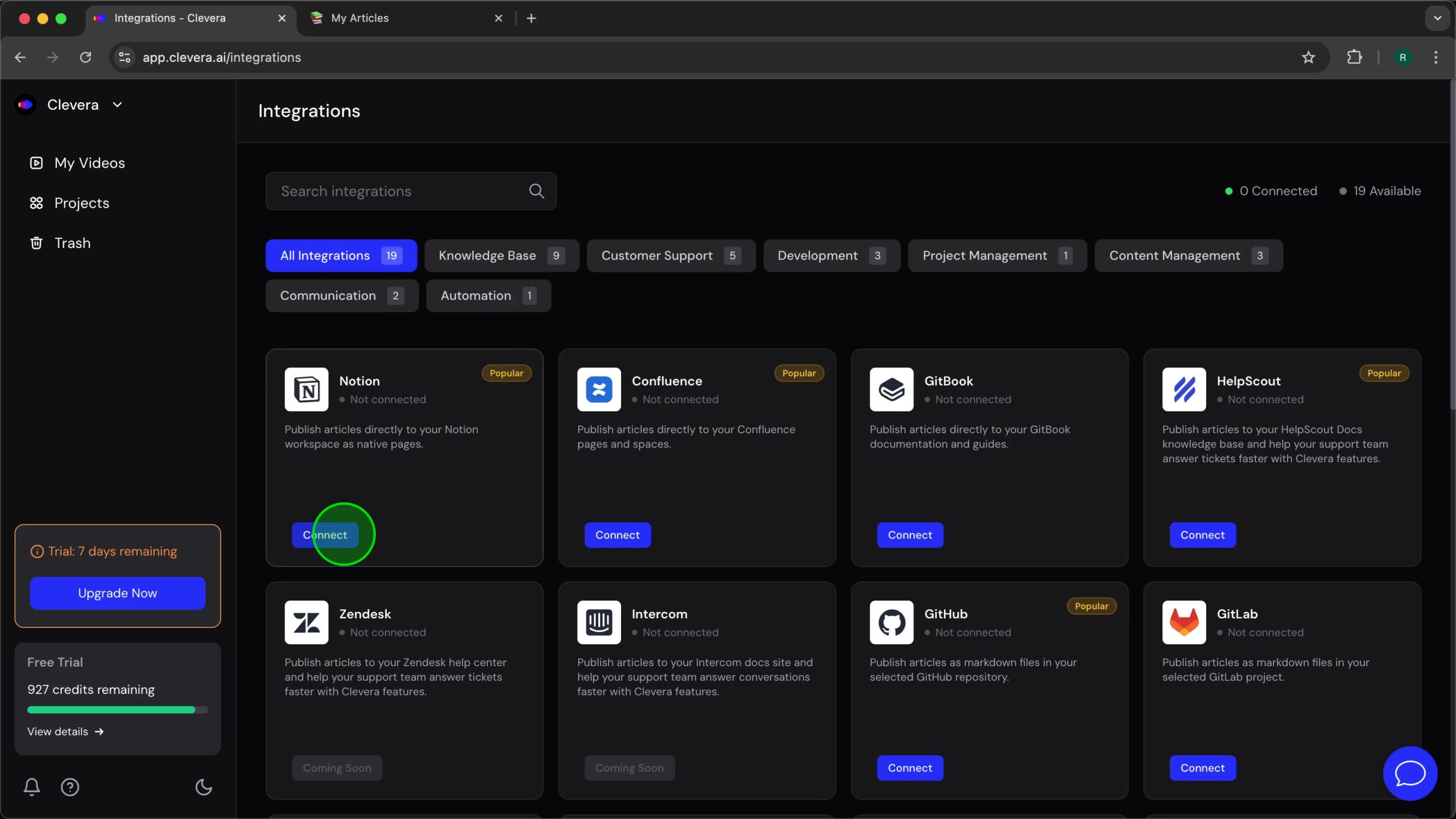 Click the Connect button on the Notion card. This action initiates the secure OAuth connection flow, redirecting you to Notion’s authorization page to grant Clevera access.