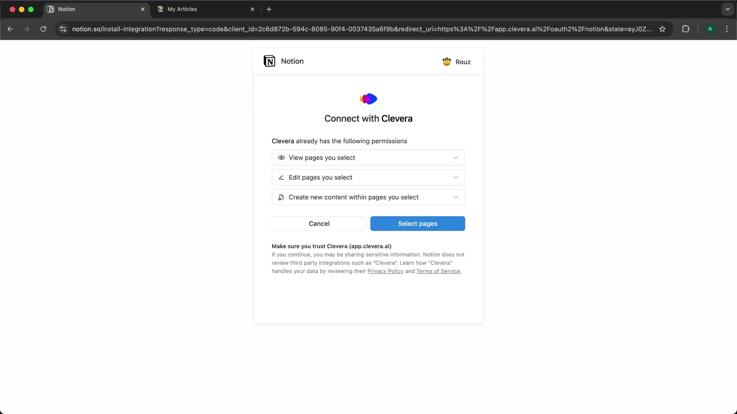 ℹ️ Info: The permissions requested let Clevera create and edit pages only within the pages or databases you explicitly approve—this keeps scope limited and secure.